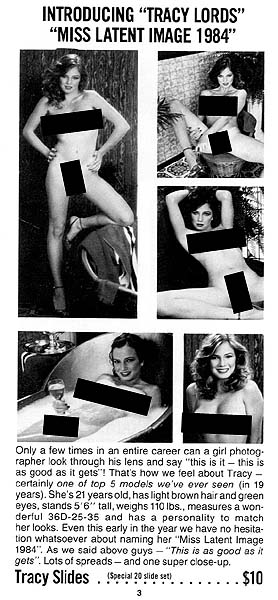 Tracy Slides #1: 20 slide set offered in the Spring 1984 catalog supplement. Some of these photos later appeared in the British adult magazine Mayfair (vol. 20 #9) as well as the U.S. adult magazine Cavalier (11/84) - both magazines feature the same photos. The Mayfair pictorial was reprinted in The Best of Mayfair #10 (a supplement to vol. 25) a few years later. The photographer was Larry Caye. Traci was also named "Miss Latent Image" in this catalog and appeared on the front cover.