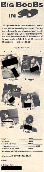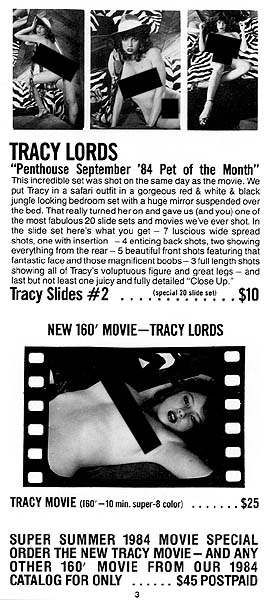 Tracy Slides #2: This second set of 20 slides was offered in the Super Summer Sale 1984 catalog. Sometimes called the "Safari" photos because of Traci's attire and the background in the room, these slides were taken at the same time that the "Tracy Lords" 8mm loop was shot. The loop makes it's debut as well. Again, Traci appeared on the cover of the catalog.