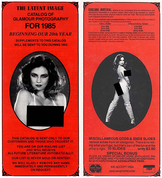 The Latent Image specialized in "glamour" photography and Super 8mm film loops focusing on solo female performances. They produced the "Tracy Lords" 8mm loop (see entry) and also offered four different sets of color slides.