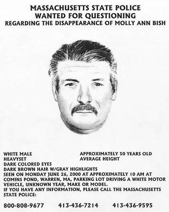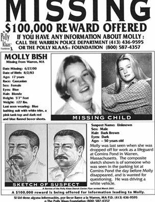 | The posters above are the first three posters that were distributed following the disappearance of Molly Anne Bish. The poster on the left was the first poster distributed by the Warren Police Department in the first few hours following Molly's disappearance. The middle poster is the first composite sketch of a man seen at the pond the day before Molly disappeared. The poster on the right was later distributed by the Polly Klaas Foundation following the release on March 19, 2001 of the updated composite sketch of the man seen at the pond. | |||||||||||||||||||||||||||||