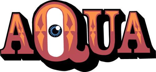 This cool logo uses the font "CoffeeTin", often used for circus, carnival or far-west settings. Not that strange, given the circus-theme of Aqua's costumes in the concert. The logo is painted in red and yellow/orange and it still keeps an eye in the hole of the "Q" letter.