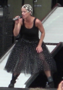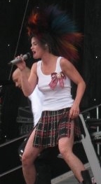 Now it's time for introducing the band and musicians. They sing together, standing one next to each other, We Belong To The Sea. Then, it looks like it's time of saying goodbye: the band walks out of the stage and a video of Goodbye To The Circus is played on the screens, with Claus, Lene, René and Søren dressed as clowns. But it's not the end of the concert, as Aqua still has to perform Around The World and their very first hit in Denmark: Roses Are Red. For this last section of the concert, Lene dresses and looks like a weird punk, this must be the strangest wig she has ever worn.