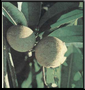 | Local names: Chico (most dialect) Chico / Sapodilla (Eng.) Scientific Name: Achras zapota L. Description: A small branching tre. The leaves are oblong with a brownish powdery lower epidermis. The fruits are ovoid, fleshy and rough. The black, hard seeds are embedded in the sweet pulp. Medical Uses: Prepare the decoction of the bark. Drink as needed. The fruit that is not overly ripe yet is good for dysentry. |