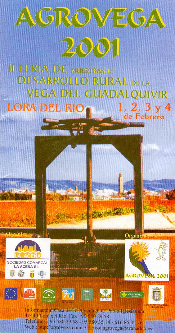 Con el debido apoyo institucional, que es garantía de futuro para años venideros, echó a andar en Lora del Río en el año 2000 la Feria de Desarrollo Rural de la Vega del Guadalquivir, la Feria de Muestras Agrovega. Del 10 al 13 de febrero de dicho año, nuestro pueblo fue lugar de encuentro de la región, en una apuesta por el desarrollo y modernización del sector agrícola y la creación de industrias transformadoras en estas feraces tierras regadas por el Guadalquivir, que como se sabe es una de las zonas agrícolas más ricas y productivas del Mundo.