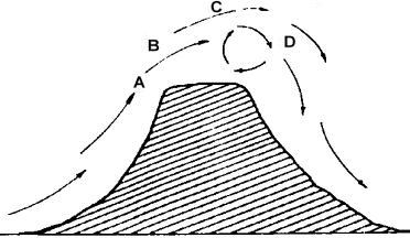 rotor en la cima y varios remolinos en la parte descendente del viento, del otro lado. Un