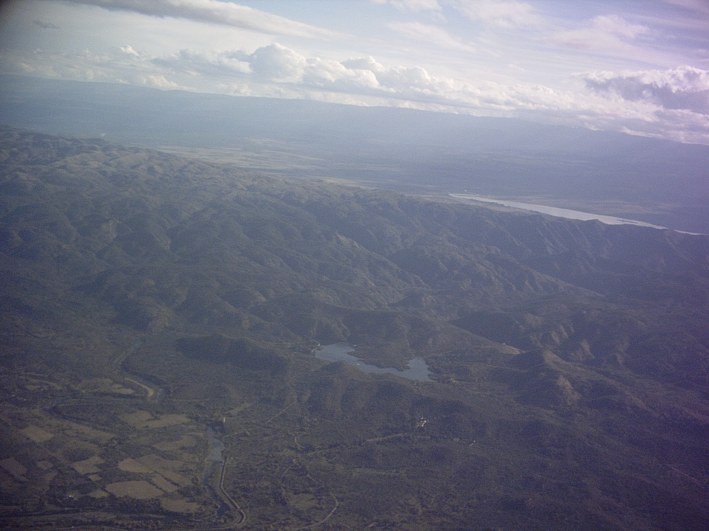 Dique Jos� de la Quintana: Sobre el arroyo Los Molinos. Atr�s hacia el oeste se ve el Dique Los Molinos, y por detr�s el cord�n de las Sierras Grandes.