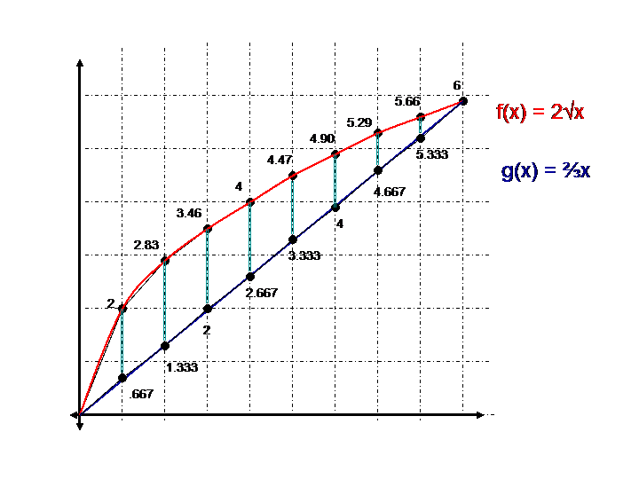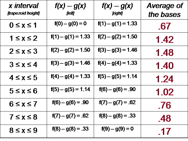 To determine the AREA of each trapezoid, we average the bases. The value of each base is the difference of the function values. Since the graph of f(x) is above the graph of g(x), they are subtracted in that order.