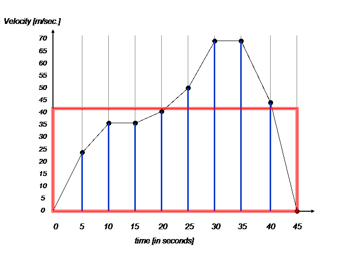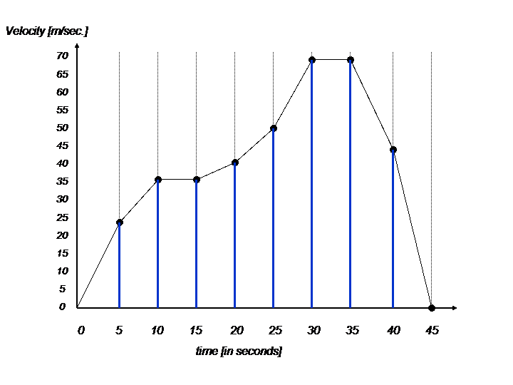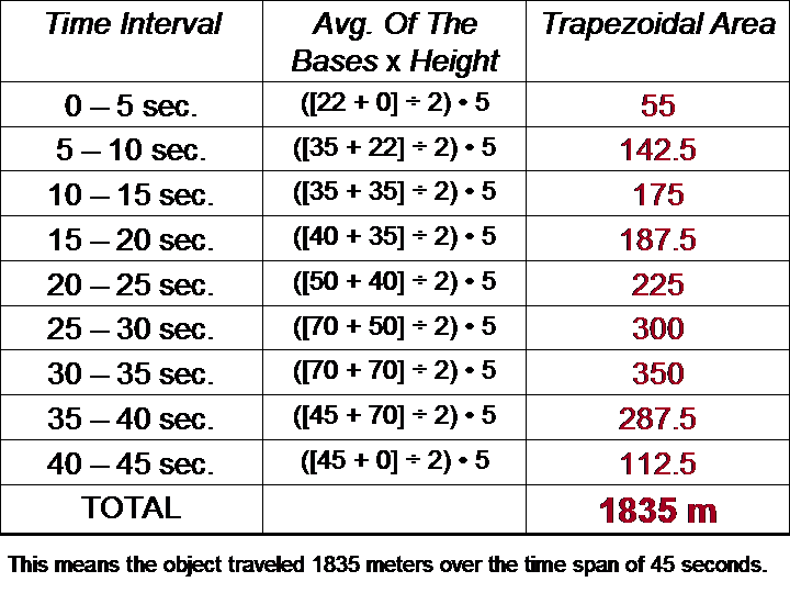 Let's go back to the velocity versus time graph as shown below. Since this graph is made up of line segments, a trapezoidal approximation will actually give us the area under the "curve".