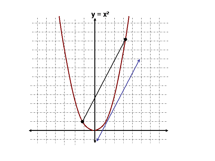 The points (-1,1) and (3,9) are connected on the above graph. The slope of the segment calculates out to [9 - 1] / [3 - (-1)] = 2
