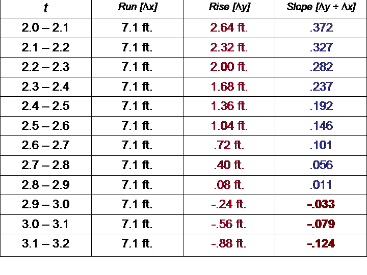 A change in direction happens around t = 2.9 to 3.0 seconds; the ball's height is less than it had previously been. This marks the first time interval where this happens. If we reconfigure our chart, we can look at this in terms of slope: