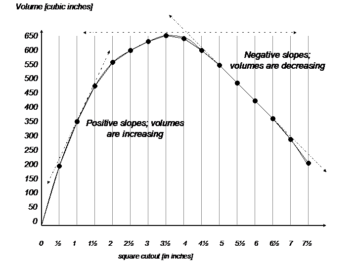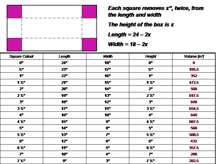 - Starting with a piece of sheet metal 24" by 14" and cutting squares from the corners, what's the maximum volume the box will hold?