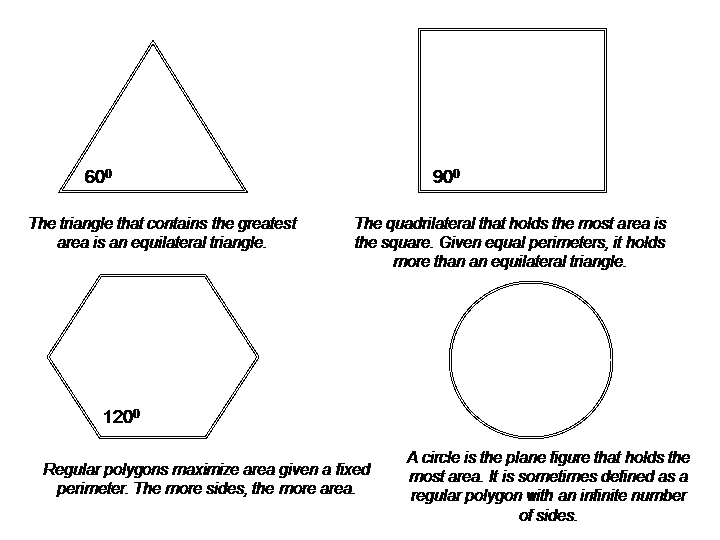 - Given 12" of perimeter, calculate the area contained by the following figures: an equilateral triangle, a square, a regular hexagon, a circle