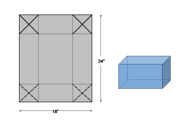 Start with an 18" by 24" piece of aluminum sheet metal. From each corner, equal square pieces will be cut out and the sheet be folded into an open-topped box.