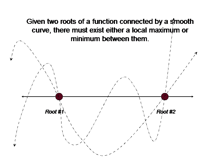 Connecting the roots with a continuous curve means that you must draw at least one max or min point between them. There certainly could be more than one such point - Rolle's Theorem states that at least one will exist.