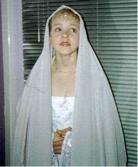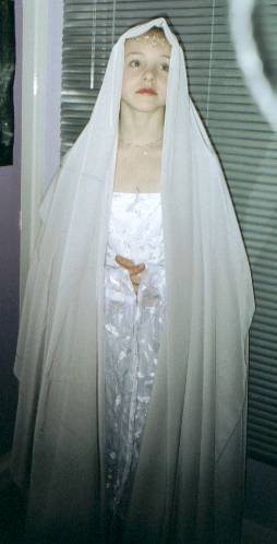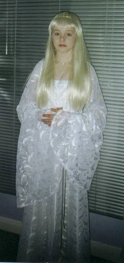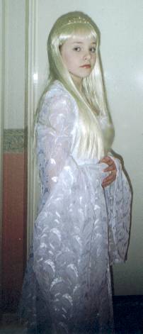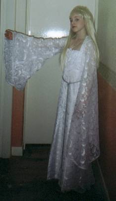| Galadriel's Mirror Dress This was my first attempt at a costume from LOTR. I made it for Emily, (who is seen here modeling it). I used white silk for the underdress and a very sheer, translucent lace patterned with leaves for the overdress and sleeves. For the cloak I used a thin silver silk (it was quite heavy actually). The pattern I used was McCalls 3010 and I did it all per the pattern. The cloak I just made up. By the way she is wearing a wig! |
