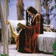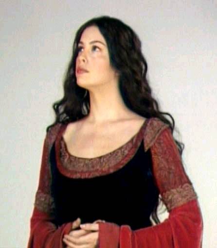| The Blood Red Dress was not featured in TTT as originally thought, which is a disappointment as it is another beautiful dress that Arwen wears. This dress, like many others, symbolises a lot of things. First of all it is not a light flowing dress, like most of her other dresses, it is quite heavy and it looks as if it is weighing her down in this photo on the right. The sleeves are made of silk velvet, which is a heavy weaved fabric, and are long, almost floor length. The skirt on the overdress pools around her feet because it is so long and has a large train. It is made out of velvet, which is also a heavy fabric. The weight of the dress interprets the mortal life she has chosen and that she is facing humanity. Also, because of the alleged scene it is in, it symbolises death, because she is still in mourning over the death of Aragorn.. The colours also symbolise her feelings. Red is a very strong colour and in this case it is blood red. This shows that there has been a death, which in this case there has been. The Midnight Blue velvet, which looks black, symbolises mourning and grief as she has just visited Aragorn's grave and his death is still plagueing her. It is also ironic that supposedly she dies in this dress, so the colours and weight also symbolise her death and the end of her days. |