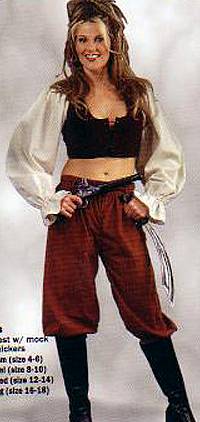 | Patterns The pattern we thought would work the best for the pirate look we were trying to achieve was McCall's 2258. It has everything that a pirate costume needs; the jacket, the shirt with the large gathered sleeves, the waistcoat, the cropped trousers and this one even had the hat! Even thought Jack Sparrow wears a jacket at the beginning of POTC, Sophie decided to just go with the waistcoat, shirt, hat and trousers as this is the costume seen most throughout the film, plus there had to be some distinguishable differences between mine and Sophie's costumes. Of course then there was the problem of the pattern we'd decided on to make our costumes not being so female modification friendly so I ended up drafting mine and Sophie's costumes using the purchased pattern as a basis. The costumes actually turned out far different from the McCall's pattern except for the parts where I'd actually followed the original pattern, for instance my coat. At least this way though we were getting what we wanted and it would fit us exactly as we wanted. So that Sophie's waistcoat wasn't too bulky we decided to intervein the shirt pattern into the waistcoat pattern. What I mean can be better seen on the picture on the left of a female pirate costume which helped me with some ideas for modification. We ended up using some trousers I'd made originally for a Hobbit costume as our pirate trousers and dyed Sophie's a deep grey. |