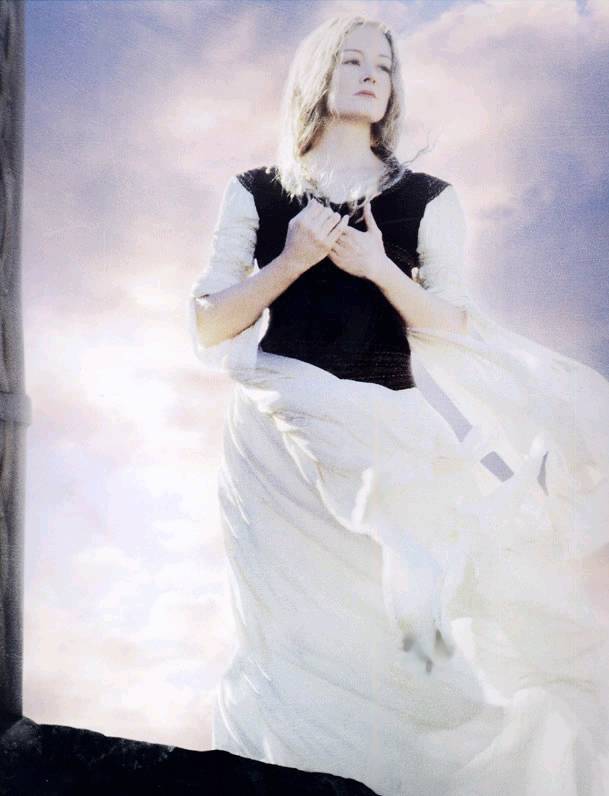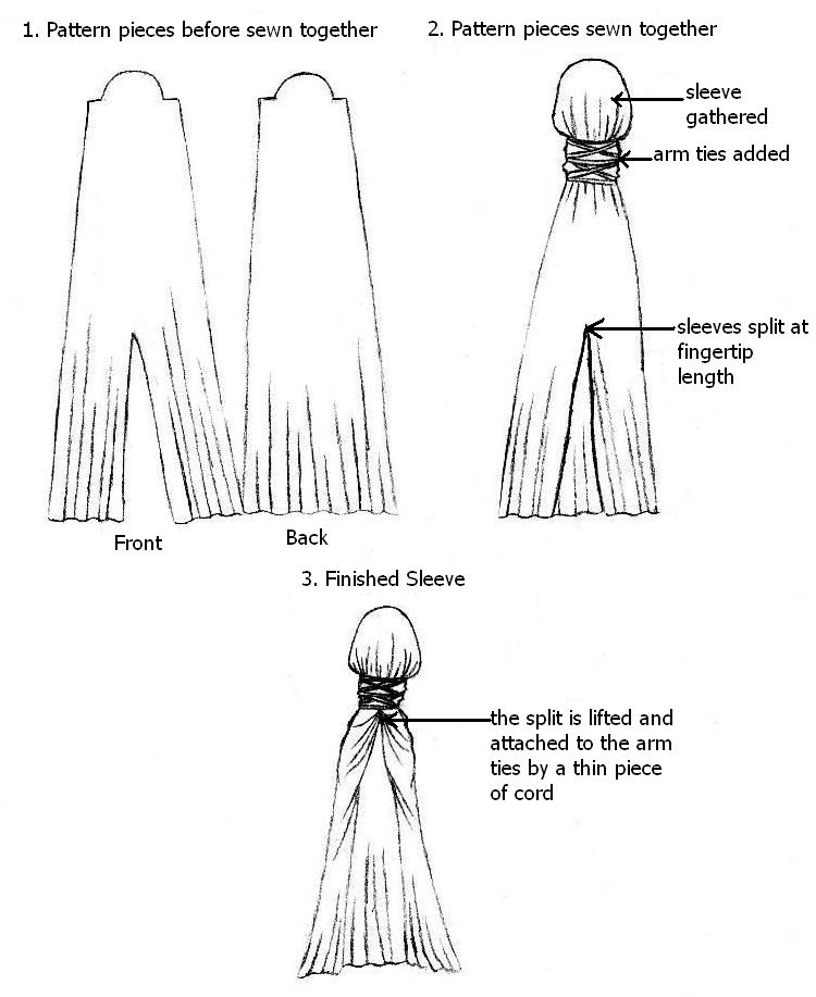 I then punched grommets into the bias tape on each edge, five on each side, and laced thin, cream cord through. This is because I added a lacing decoration to my chemise so it would fit better around the chest. Next I made the sleeves for the chemise. I didn't have a pattern anything like these sleeves, so I drafted one myself. I used the top off the sleeve pattern for Simplicity 9891 (the Galadriel style sleeves) and then drafted the rest myself. The fabric I had bought was only 45" wide and I had a metre and a half left of it. I divided the width equally by two and then cut the fabric in half, so I was left with two pieces of fabric both 22.5" wide and a metre and a half long. I then sewed the edges together on each sleeve so I had two long tubes, and I attached these to my chemise. Then I measured my fingertip length on the sleeves and cut the split upwards. I just left the sleeves like that for a bit so I could continue work on my vest. Then the sleeves started to annoy me as they weren't anywhere as wide as the actual sleeves on the chemise, which have to be at least a metre wide. After a while of consideration and hesitation a final push off of a friend made me redo the sleeves again. |