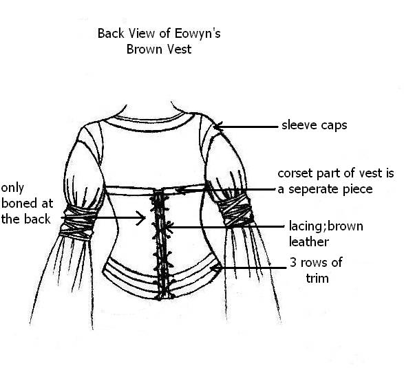 | I had bought some very pale gold cord to use as the ties for the arms. I had not bought enough though as the cord is wrapped around the sleeves on the chemise 3 times and the ends of it extend to knee length. I only have enough cord for a four or five inch extension. After I'd made the body of the chemise, sleeves and altered the neckline I hemmed the bottom of the sleeves and skirt on the dress and then added french seams. Once I'd made the chemise, then I started on the vest. The leather I was using was pretty thin and not very tough making it easier to sew and it didn't break any needles. Firstly I made a muslin of the vest pattern, altering the neckline into a curved v-neck and extending the tops of the sleeves into sleeve caps. Then I made the bottom of the pattern curved to match the shape of the base of the actual vest. Making the back of the vest was tricky even when I was only making a muslin. I did the back of the vest per the pattern, except the curved base and the sleeve caps and then I made two wings. I then tacked all the pieces of my muslin together to see if my alterations had worked and luckily it worked first time. Then I cut out my hero fabric using this pattern. Once I'd made the vest per my muslin pattern I added the wings to the side seams of my vest. Once the vest was complete I added the trim. I decided to use trim on my vest because I'm not very good at embroidery let alone embroidery that is only 1cm wide, or about that, and very delicate. Anyway, I put three rows of trim at the base of my vest, one row below the bust area, one row around the neckline and two rows on the sleeve caps on the front of the vest. |