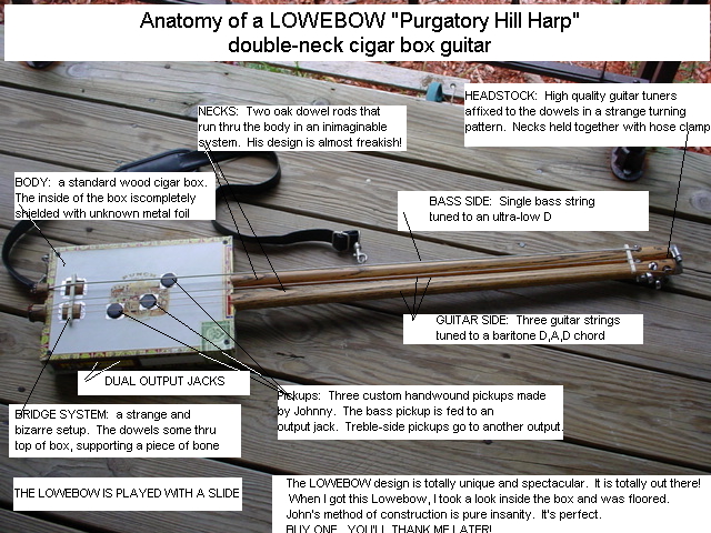 | THE LOWEBOW is pure alchemy. It is Johnny's artistic creation, mixing southern mojo, electric mayhem and traditional blues materials. I own the Lowebow that is pictured here and I can attest to the power it contains. Johnny sells these handcrafted gems in his XANADU MUSIC AND BOOKS store in Memphis. He usually has several different models ready for sale, but he can also make you a custom Lowebow. A note to would-be counterfieters: You cannot copy a Lowebow and really should not. These instruments are pieces of art unique to Johnny Lowe alone.. The design is absolutely revolutionary. |