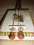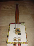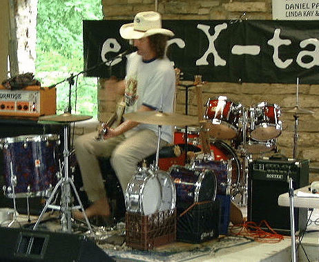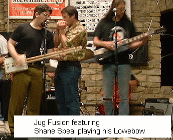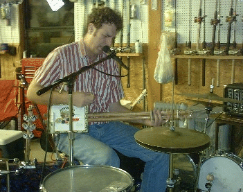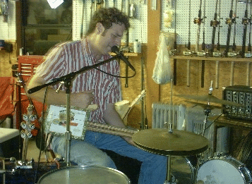 | left: Johnny, making ears bleed with his full rig at the Cigar Box Guitar Festival, May '04. below: a 2003 performance |