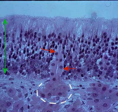 Another type of cell found in the olfactory epithelium are columanr shaped supporting cells. These pigmented cells account for most of the bulk of the epithelium. Also found in the epithelium are short basal cells that are the source for new receptors. |
