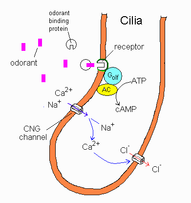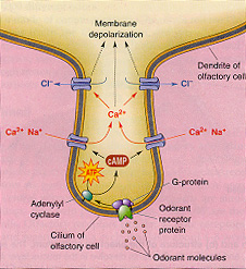 | Once the odorant has dissolved it stimulates a G protien on the cilia of the receptor cell. This stimulation causes Adenylyl cyclase (an enzyme) to be activated. This enzyme speeds up the converison of ATP to cAMP. Cyclic adenosine monophosphate (cAMP) binds to action channels in the membrane of the cilia. The channel open allowing Ca++ and Na+ to enter the cilia. The presence of Ca++ and Na+ cause the membrane to depolarize (become more positive) and an action potential is created. | ||||||||||||||||||||||||||||||||||