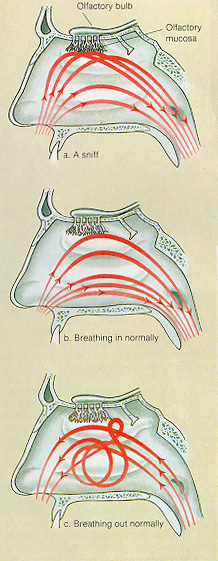 | Air moves fairly quickly throught the nasal cavity (250 mL/s). Therefore only a small amount of air actually comes in contact with the olfactory epithelium. A sniff allows more air to come in contact with it. | ||||||||||||||||||||||||||||||||||