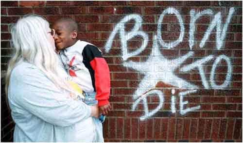 Conner kisses her son, Ricky, 8 from Fowler, Ohio, while posing