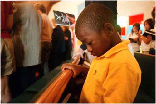 Ricky Conner, 8, vows his head down during a prayer at Prince of Peace Church on a Sunday morning.
