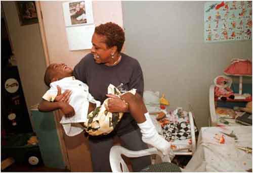 Santonia Williamson, from Warren, Ohio, who has been tutoring Ricky for a year, carries him into his home school classroom after a few unsuccessful attempts at calling him in. Marli was not able to get the local schools to take Ricky.