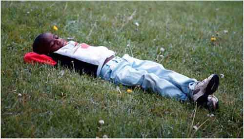 Ricky lies down on the front lawn of the First Church of God in Cortland after delivering some food to the church from Second Harvest Food Bank.