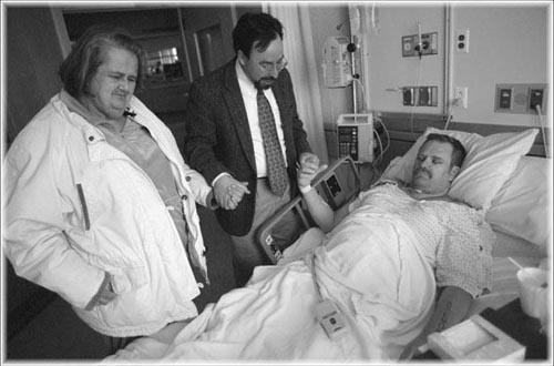 Bob, his mom, and his pastor say a prayer in the recovery room.