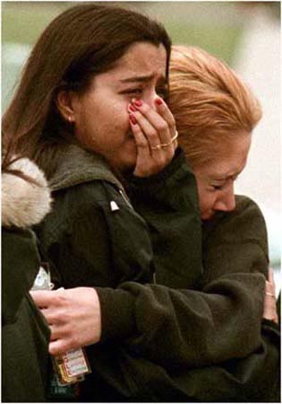 Two high school girls comfort each other as they watch the remains of a friend's car get towed away. Four Hudson High School Students were taken to Robinson Memorial Hospital after being involved in a two-car collision during school hours.