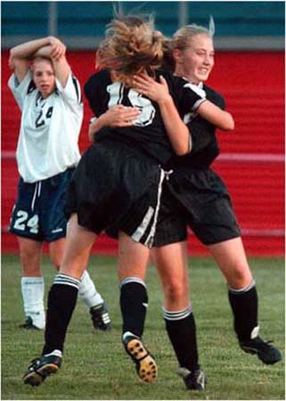 Howland High School's Lauren Boryenace, number 15, and Candice King, number 12, celebrate after scoring Howland's second goal against long time rival Niles High School. Howland won 2-1.
