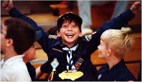 Cub Scout Cody Dillon, 6 from Newton Falls, Ohio, celebrates after seeing his car finish first at a pinewood derby held at Turner Elementary.