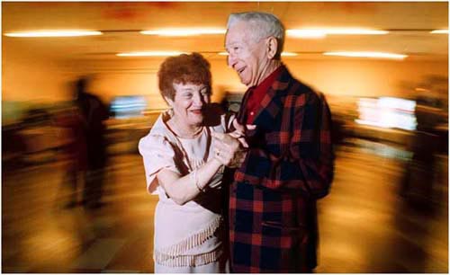 Flo Brown, 67, from Howland, Ohio, takes the dance floor with Bruce Phillips, 79, from Hubbard, Ohio, at a senior prom dance at Lakeview High School.