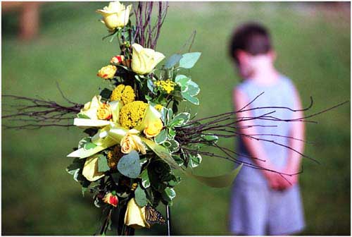 Matt Walkenhorst, 5, from Ft. Thomas, Ohio, bows his head after the release of monarch butterflies during the anniversary memorial for his cousin Kyle Hesselbrock, who died a year ago at 2 years, 9 months, and 5 days.