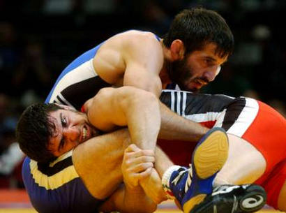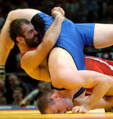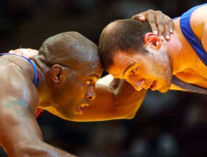 | Final de los 120kg. El local Kerry McCoy (izquierda) frente al representante de Uzbekist�n Artur Taimazov, quien le dar�a el segundo oro a su pa�s. Desde el mundial de 1999 que Estados Unidos no consigue un t�tulo en Lucha Libre. |