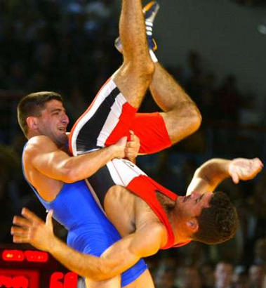 | El veterano Gocha Ziziashvilly, de Israel, festeja su notable victoria ante el sueco Abrahamian en la final de los 84kg y le da a su pa�s la primer medalla de oro de su historia. |