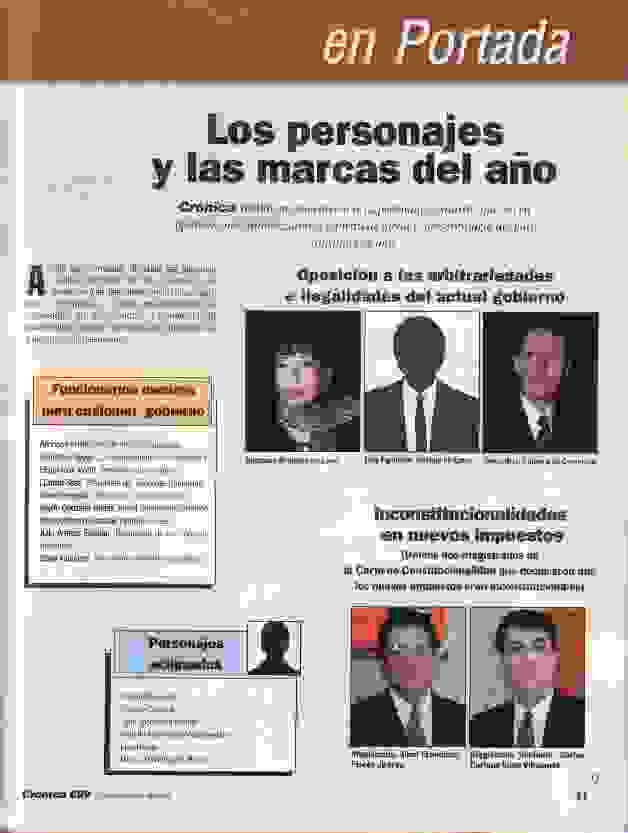 | Sede Fotografías ¡Viernes de Luto, personaje del año! El equipo de Viernes de Luto, representado por su servidor, fue seleccionado por la revista Crónica entre los 12 personajes del 2001. El reportaje dice así: en Portada Los personajes y las marcas del año Crónica resalta en esta edición a 12 personajes y marcas que, en su opinión, más simbolizaron el esíritu de lucha y perseverancia del país durante este año. Ante los momentos de crisis las personas suelen reaccionar de dos maneras: o se paralizan y se dejan llevar por las circunstancias o se emplean a fondo para transformar la adversidad en oportundiad. La mayoría de los guatemaltecos optaron por lo segundo, luchando día a día contra el pesimismo. Oposición a las arbitrariedades e ilegalidades del gobierno Diputada Arabella De León Luis Figueroa, Viernes de Luto Jorge Briz, Cámara de Comercio Inconstitucionalidades en nuevos impuestos (Unicos dos magistrados de la Corte de Constitucionalidad que declararon que los nuevos impuestos eran inconstitucionales) Magistrado suplente, Carlos Enrique Luna Villacorta Magistrado, Juan Francisco Flores Juárez Entretenimientos (Por presentar a nuestro país y su sentido del humor en el programa HBO, "Séptimo Sentido" Celia Recinos Josué Morales Deportes (Organizadores de los Séptimos Juegos Centroamericanos y del Caribe Ricardo Castillo Sinibaldi Dr. Fernando Beltranena Servicio Social (Tres Entidades que han colaborado con la niñez Guatemalteca) Aldo Castañeda y Yolanda Cofiño de la Fundación Aldo Castañeda y MacDonald´s Marielos Montenegro de la Fundación Ayúdame a Vivir Anterior Las jornadas de marzo de 2002 |