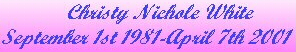 | Tribute To Christy White Was Completed In October 2001 (6 months after she passed away and is updated) Please "REFRESH" if there are no roses on page. Thanks. |