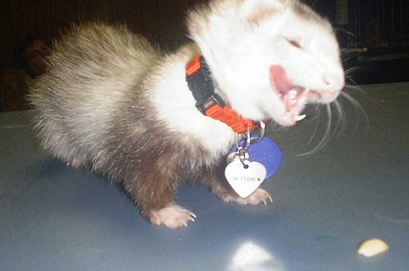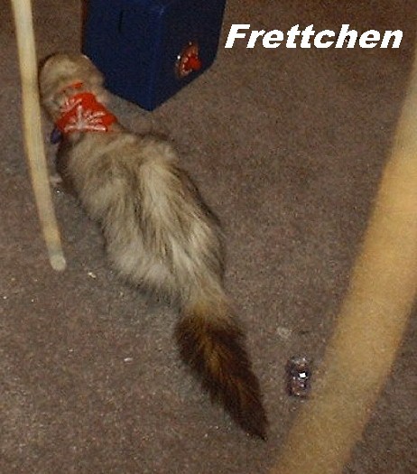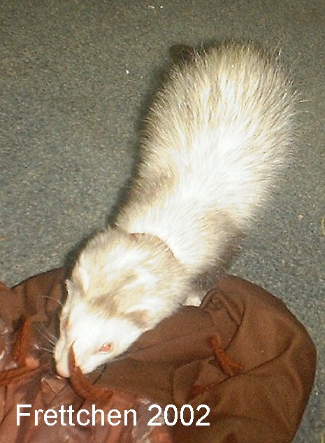 Here is Frettchen doing her favorite thing-Kissing! She is a very kissy little ferret. She want the whole world to know how much she loves them. Frettchen is a very loving ferret, and looks forward to seeing Jen, the lady that gave Frettchen to us, once or twice a month. Frettchen really loves her, and I'm glad Jen has the chance to see Frettchen when ever she wants. |