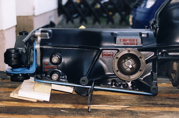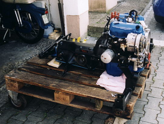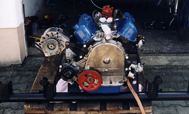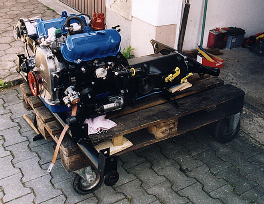 | Als N�chstes montierte ich alle Zuleitungen Richtung Motorbucht die noch fehlten. Ich lie� mir neue Bremsleitungen anfertigen, unn�tig zu erw�hnen das nat�rlich dabei etwas schief ging... Ein B�rdel sammt Verschraubung war falsch. Klar das ich das erst feststellte als die Leitung schon eingebaut war. Abgesehen davon, man mu� echt ein "Schlangenmensch" sein um die ganzen Leitungen, Kabel etc. unter der Notsitzbank zu montieren. Kleiner Tip: Heftpflaster in ausreichender Menge bereithalten!!! Am Motor erledigte ich nun die letzten n�tigen Arbeiten vor dem Einbau. Dazu z�hlten das Lackieren mit hitzefestem Lack, das montieren von Nebenagregaten und diversen Halterungen. Zwischenzeitlich hohlte ich mir Infos wie Andere vor mir einen Motor-Getriebe-Einbau bewerkstelligt hatten. Im Werkstatthandbuch wird einen Methode mit komplett vormontierten Hilfsrahmen beschrieben. Mir erschien aber das Einf�deln der vorgespannten Federn gleichzeitig mit den Flanschen des Hilfsrahmens und der Sto�d�mpfer als etwas sehr "sportlich". Klaus Harthof schlug mir eine sehr interessante Variante vor, deren Vorteil in der "One man show" liegt. Zun�chst das Achs-Querrohr allein montieren, dann Motor von oben (ohne Schwungscheibe) einsetzen, Getriebe von hinten einschieben, Schwingen, Antriebswellen nacheinander einbauen. Die Version den Rahmen von oben via Hebeb�hne auf den ausgerichteten und komplett montierten Hilfsrahmen abzusenken fiel aus Ermangelung einer Hebeb�hne in meiner Norm-Garage aus. Ich entschied mich dann zu einer Vorgehensweise die ein Misch-Masch aus allen anderen M�glichkeiten darstellte. Auf meiner rollbaren Europalette baute ich zun�chst das Achsquerrohr an den Motor an. Mit ein bi�chen Gezerre ist das ohne weiteres alleine m�glich. Als n�chstes flanschte ich das Getriebe an. Nochmal HERZLICHEN DANK an die Ford Konstrukteure die dem Getriebe eine demontierbare Hauptwelle verpasst haben. EINFACH GENIAL!!! Ich habe die Gtriebe-Hauptwelle rausgezogen, das Getriebe ungef�hr an den Motor angelegt, mit den Haltebolzen zusammengezogen und dann die Hauptwelle wieder hinten durch das Getriebe gesteckt. Nat�rlich hat die Welle sich verbissen aber was solls? Kurz an der Kupplung gedr�ckt und das wars! Nun sollte die "Hochzeit" stattfinden! Ich lud dazu einige Freunde und Schrauber ein, mit der Aussicht auf eine anschlie�ende angemessene Feier... Sowas wirkt fast immer! |