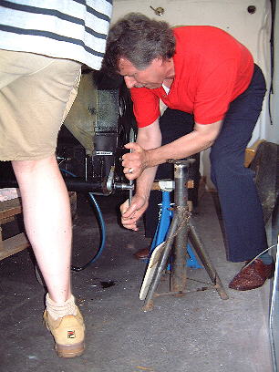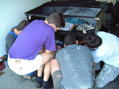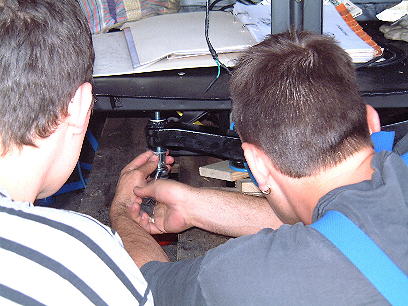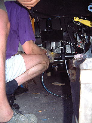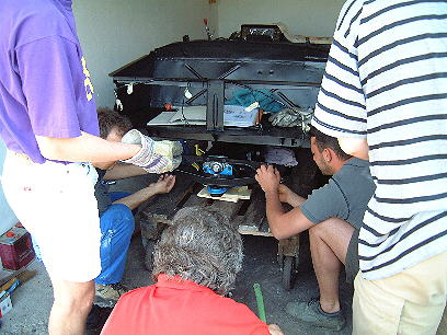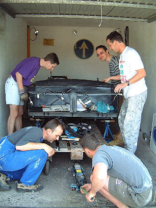 Aber zun�chst wurde immer noch Gefummelt... Linker Flansch von "Cuore Sportivo".... Der rechte Flansch wurde von meinem Nachbarn "bedient", der uns sogar in seinem "Sonntagsstaat" tatkr�ftig unterst�tzte... Als das Achsquerrohr angeflanscht war stellte wir den Rahmen an den Schwellerenden auf B�cke. Um das �berhaupt zu schaffen hoben wir die Europalette links und recht synchron mit 2 hydraulischen Wagenhebern an. Die Motor-Getriebe-Einheit lag nun vorne in den eigentlichen Lagern, st�tzte sich aber hinten immer noch auf der Europalette ab. Und die $%&*#! - Getriebeaufh�ngung lag immer noch um einige Zentimeter neben der eigentlichen Position. Zu Rechts?... Zu Links?... ZU SCHEISSE!!! Aber mit vereinten Kr�ften, Fl�chen, einem Montiereisen, einem weiteren Wagenheber und �berlangen Schrauben klappte es endlich doch noch! Die Getriebeabst�tzung war drin und damit die "Hochzeit" vollzogen! |