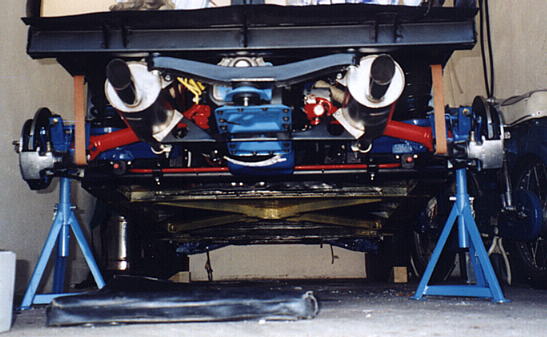 | Nachdem der Hilfsrahmen, mit Motor und Getriebe, endlich an seinem vorgesehenen Platz war konnten die restlichen Arbeiten ausgef�hrt werden. Wasserschl�uche montieren... Spritschl�uche einbauen... Kabelbaum anschlie�en... Schaltgest�nge noch vor den Hinterachsteilen montieren... L�ngslenker, Federn, Antriebswellen, Bremsen und Querstabi einbauen.... Und gleich einstellen weil man ohne Auspuff und Achse so sch�n hinkommt... (Das stellte sich sp�ter als Fehler raus!!!) Bis dahin verlief alles ohne nennenswerte Schwierigkeiten, aber dann ging es wieder mal los. Anpassen des Auspuffs...�$%# Hosenrohre rechts und links passen nicht, die Edelstahlrohre etliche Male einges�gt, gebogen und zum �rtlichen Schlosser zum Schwei�en gebracht. Die Geschichte zog sich �ber 3 Wochen mit fast t�glicher Arbeit hin. Gut, nachdem Alles eingebaut war und das "Auto" zwar nicht auf R�der aber immerhin auf B�cken unter den L�ngslenkern stand, zog ich die Bolzen des Hilfsrahmens nach Vorgabe an. Probesitzen im nacken Chassis, in der Schaltung r�hren...es klemmt und keine Schaltebene stimmt mehr ??? Bei der Verlagerung des Chassis in den "Fahrzustand" ist der Hilfsrahmen scheinbar noch mal um ein paar Milimeter gerutscht, damit war dann die Geometrie der Schaltung beim Teufel. Toll! Schaltung neu einstellen, bei montiertem Auspuff und Achse...Fummel, Fummel, Fummel! |