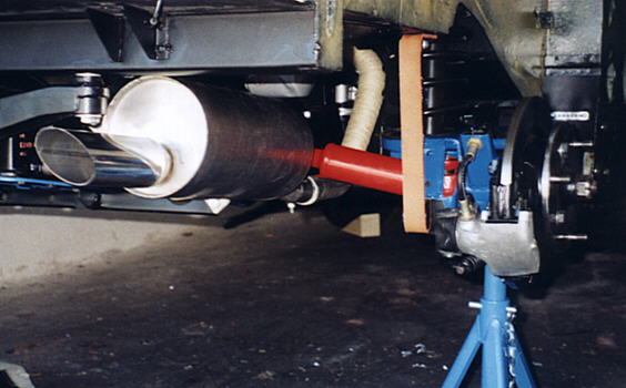 | Die Hosenrohre der Auspuffanlagen umwickelte ich mit sogenanntem "Fire Tape" um die Hitze in der Motorbucht etwas zu senken. Am meisten Hitze strahlt ja bekanntlich das erste St�ck der Auspuffanlage/Kr�mmer und nicht der Motor selber. Es sind die Bereiche vom Zylinderkopf bis H�he Unterboden umwickelt, wie man auf den Bildern links (mehr oder weniger) erkennen kann. |