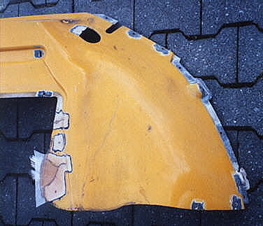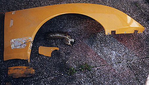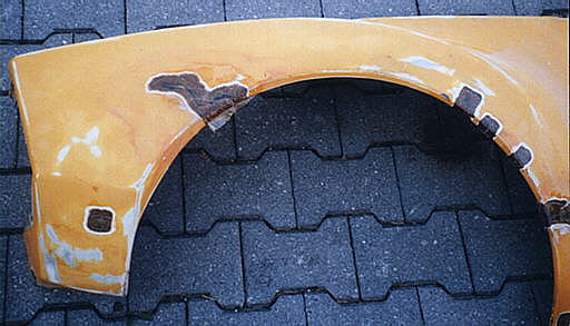 | Nachdem die Montage der Technik vollzogen war konnte ich nun die Montage der Karosse als n�chtes Ziel ins Auge fassen. Zun�chst durfte ich dazu unz�hlige Risse und L�cher in der GFK Haut zulaminieren. Um nicht die selbe Arbeit mehrmals zu machen verharzte ich die besch�digten Stellen noch bevor ich die gesammte Fl�che der GFK Teile von ihrem alten Lack befreite. LINKS: Der Zustand des hinteren rechten Kotfl�gels ist beispielhaft f�r die ganze Karosse...L�cher und Risse! RECHTS: Der vordere rechte Kotfl�gel war kaum noch zu retten, eine barbarische Reparatur mittels einer einlaminierten Blechplatte und diverse abgebrochene Bereiche bedeuteten das technische K.O. RECHTS: An der unteren Frontverkleidung bot sich das �bliche Bild, Ausbr�che, Risse und L�cher. Au�erdem noch tiefe Kratzer von zahlreichen "Aufsetzern". |