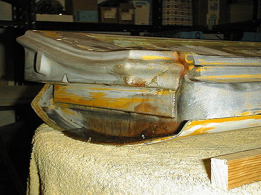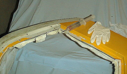 | OBEN: Die Verkleidung des �berrollb�gels wies zwar keine Risse oder L�cher auf, daf�r hatte sich der einlaminierte Blechrand f�r die Heckscheibendichtung vom GFK "befreit". Nachdem ich die schlimmsten Bereiche mit Harz und Glasfiebermatten repariert hatte, unterspritzte ich die restlichen Stellen noch zus�tzlich mit Harz. UNTEN: An der rechten T�r hatte sich der vordere anlaminierte Teil des T�rkastens und ein Teil der T�rhaut (wohl ein alter Unfallschaden) abgel�st. Au�erdem waren noch einige Risse und zwei L�cher eines rechten Au�enspiegels (auf einen rechten Au�enspiegel verzichte ich an einem 70er Jahre Auto) zu "versorgen". |