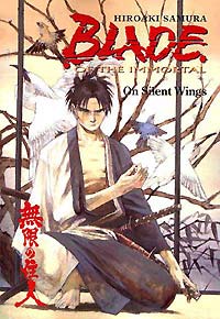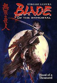 Blade of the Immortal 01: Blood of a Thousand Manji is a petty criminal trying to feed his sister who lost her mind when their parents were murderer. She is killed by other criminals, enraged Manji seeks to get revenge he comes upon an old woman who offers him a drink. But the drink wasn't exactly what he thought it was. She just fed him with a worm that takes over his body, now he can not die until he kills 1000 evil men, hence the title of the first volume. No matter how bad he is injured, and believe me he really gets his ass kicked several times in this first volume alone, the worms in his body will repair all the damage. So he does in search of baddies to kill. In the meantime Rin, the heroine of the story, is living peacefully with her parents, her father is a great swordsman who runs a respected dojo, until Anotsu comes. Anotsu is a genius swordsman with one goal, to unify all the dojo into one, of course under him and to this end he is destroying all them. Rin's parents are murdered and Rin vows revenge. She teams up with Manji and they go to find Anotsu and take revenge. The next two episodes are the best, first they corner one of Anotsu's associates, a huge guy that quotes poetry who also has two female head sewn on his shoulders one being Rin's mother, now that is really something I wasn't ready for, okay maybe carries their hair or something but to sew their heads on his shoulders, this guy really has mother issues. The next is funnier, Rin goes to the home of a family friend, another skilled swordsman and ninja who has retired and is an artist. They come at the moment where he has terrible creative constipation and while there Anotsu ninjas attack. Manji and Rin are having it out with the ninjas outside and the pov is inside his room, he is sitting trying to figure out what he should do as fighting keeps passing his open door. Finally Manji kills a guy and his blood splatters all over the canvas and the artist goes of course this is it. This is a great samurai series, it is the better version of Ninja Scroll. |